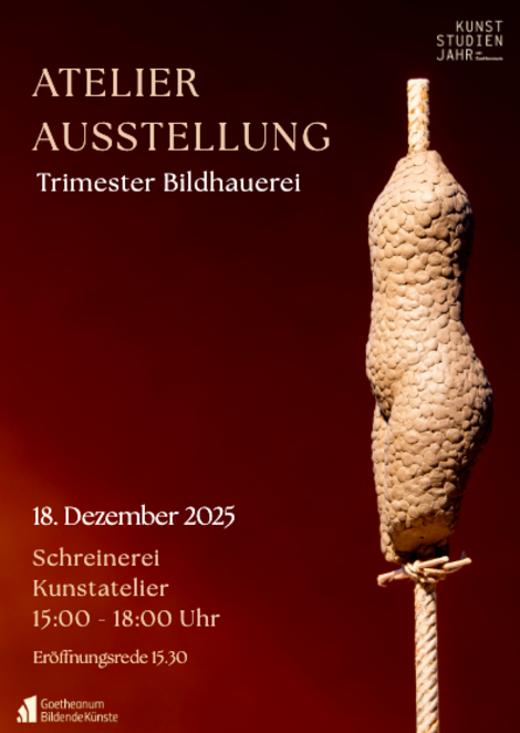 Die Studentinnen und Studenten des zweiten Kunststudienjahrs am Goetheanum haben erfolgreich das ersten Trimester BILDHAUEREI abgeschlossen. Sie werden ihre Arbeiten am Donnerstag, 18. Dezember, im Kunstatelier (Schreinerei), von 15 bis 18 Uhr zeigen.